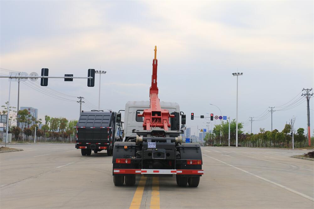 勾臂式垃圾車(車廂可卸式垃圾車)介紹: 車廂可卸式垃圾車又叫拉臂式垃圾車,是一種采用高新設(shè)計(jì)可伸縮的鉤臂,實(shí)現(xiàn)垃圾廂的二次吊裝,自吊上放下,可自行傾倒垃圾的環(huán)衛(wèi)設(shè)備。 拉臂式垃圾車結(jié)構(gòu)簡單,操作穩(wěn)定方便,裝卸效率高,機(jī)械化程度高,節(jié)省人力。鉤臂垃圾車一車可帶多個(gè)垃圾廂,在裝卸的運(yùn)輸過程中可有效地避免二次污染。 拉臂垃圾車采用高新設(shè)計(jì)可擺動(dòng)的鉤臂,垃圾箱由框架、開啟油缸、滑輪、后門和若干加強(qiáng)框架與鋼板焊接而成。調(diào)換貨廂快捷方便,貨廂上帶蓋(倒垃圾時(shí)可翻開),鉤臂垃圾車?yán)鴰w可選用碳鋼、不銹鋼材質(zhì)、內(nèi)部采取環(huán)氧樹脂防腐處理,改裝部分與原車底盤為可分離式,維修方便且保持了原車的機(jī)動(dòng)性及行駛性能。