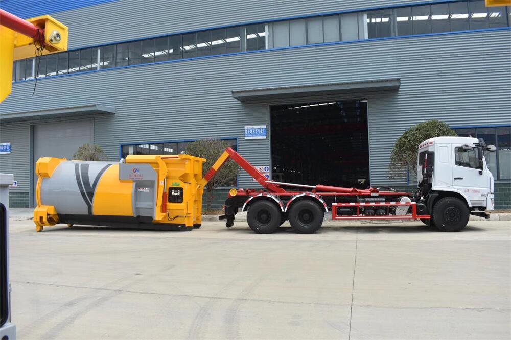勾臂式垃圾車(車廂可卸式垃圾車)介紹: 車廂可卸式垃圾車又叫拉臂式垃圾車,是一種采用高新設(shè)計(jì)可伸縮的鉤臂,實(shí)現(xiàn)垃圾廂的二次吊裝,自吊上放下,可自行傾倒垃圾的環(huán)衛(wèi)設(shè)備。 拉臂式垃圾車結(jié)構(gòu)簡(jiǎn)單,操作穩(wěn)定方便,裝卸效率高,機(jī)械化程度高,節(jié)省人力。鉤臂垃圾車一車可帶多個(gè)垃圾廂,在裝卸的運(yùn)輸過程中可有效地避免二次污染。 拉臂垃圾車采用高新設(shè)計(jì)可擺動(dòng)的鉤臂,垃圾箱由框架、開啟油缸、滑輪、后門和若干加強(qiáng)框架與鋼板焊接而成。調(diào)換貨廂快捷方便,貨廂上帶蓋(倒垃圾時(shí)可翻開),鉤臂垃圾車?yán)鴰w可選用碳鋼、不銹鋼材質(zhì)、內(nèi)部采取環(huán)氧樹脂防腐處理,改裝部分與原車底盤為可分離式,維修方便且保持了原車的機(jī)動(dòng)性及行駛性能。