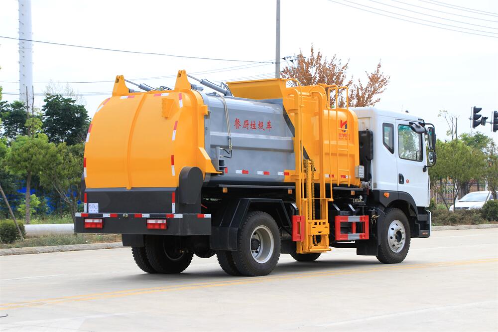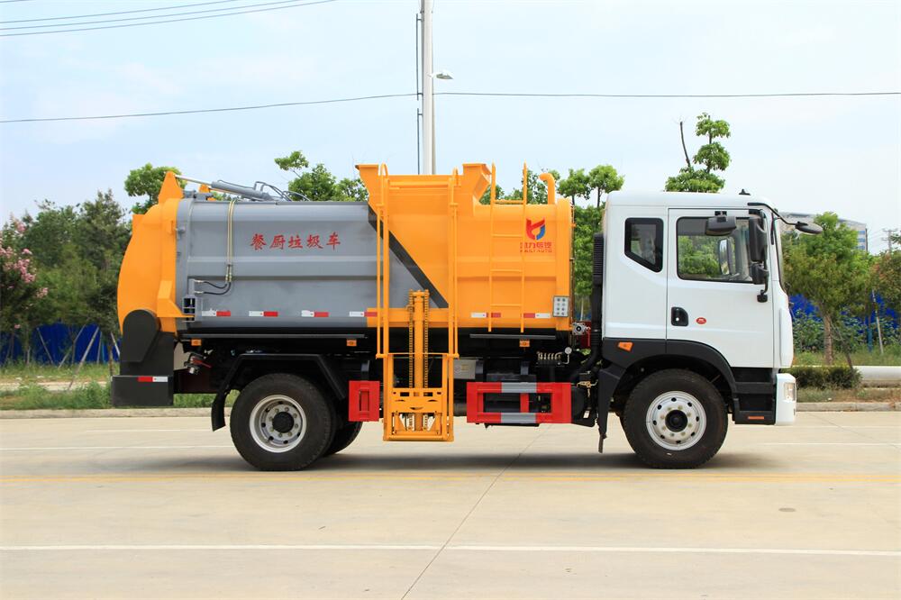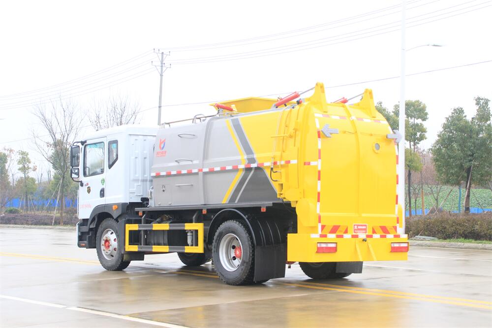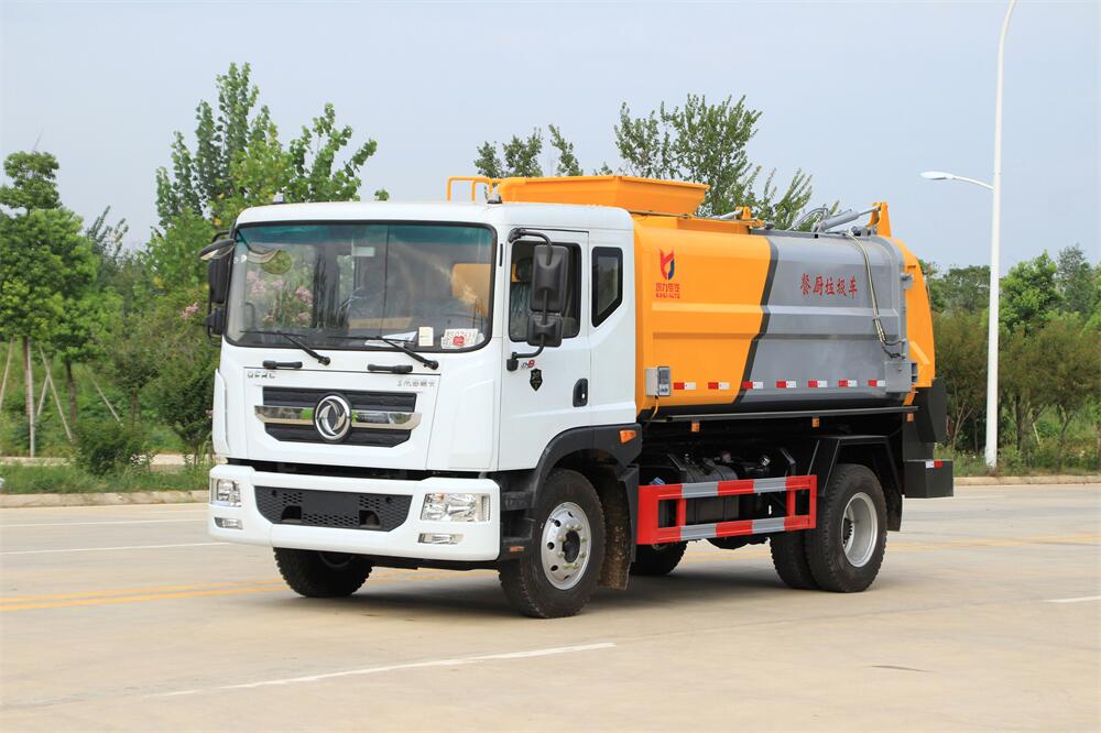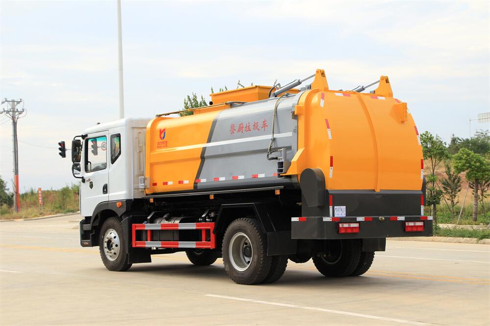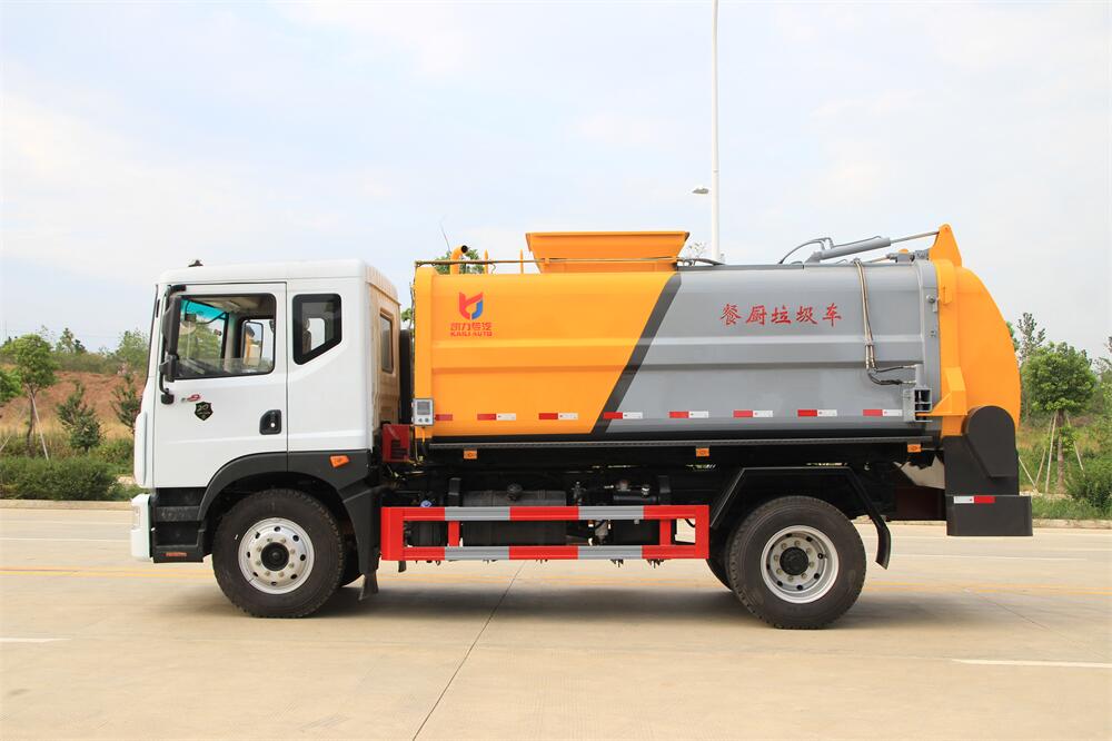 上裝配置:罐體容積10m3,配備120L/240L掛桶提升翻轉(zhuǎn)機(jī)構(gòu),液壓系統(tǒng),后蓋液壓鎖緊開啟,罐體可以舉升自卸,尾部帶自流閥;用于運輸液態(tài)垃圾,其特點操作簡單,密封性好,無泄漏,無異味;可選裝固液分離功能,推板擠壓功能,常用于餐館的垃圾轉(zhuǎn)運處理。