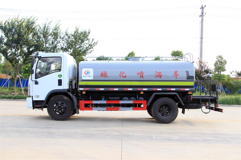 灑水車(chē)前裝有鴨形噴嘴或圓頭沖嘴,后面裝有圓柱開(kāi)灑水噴嘴或蓮蓬頭噴嘴,后部有一工作平臺(tái),裝配有水炮。后部還可裝8個(gè)噴嘴(選裝)。