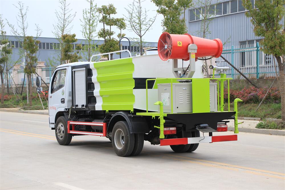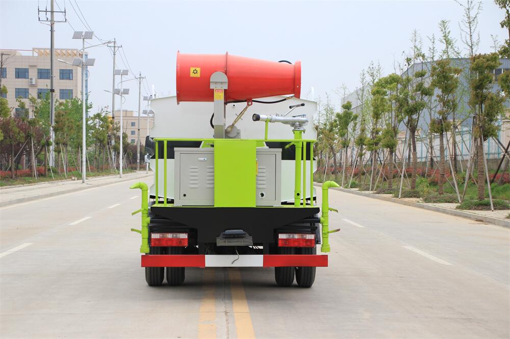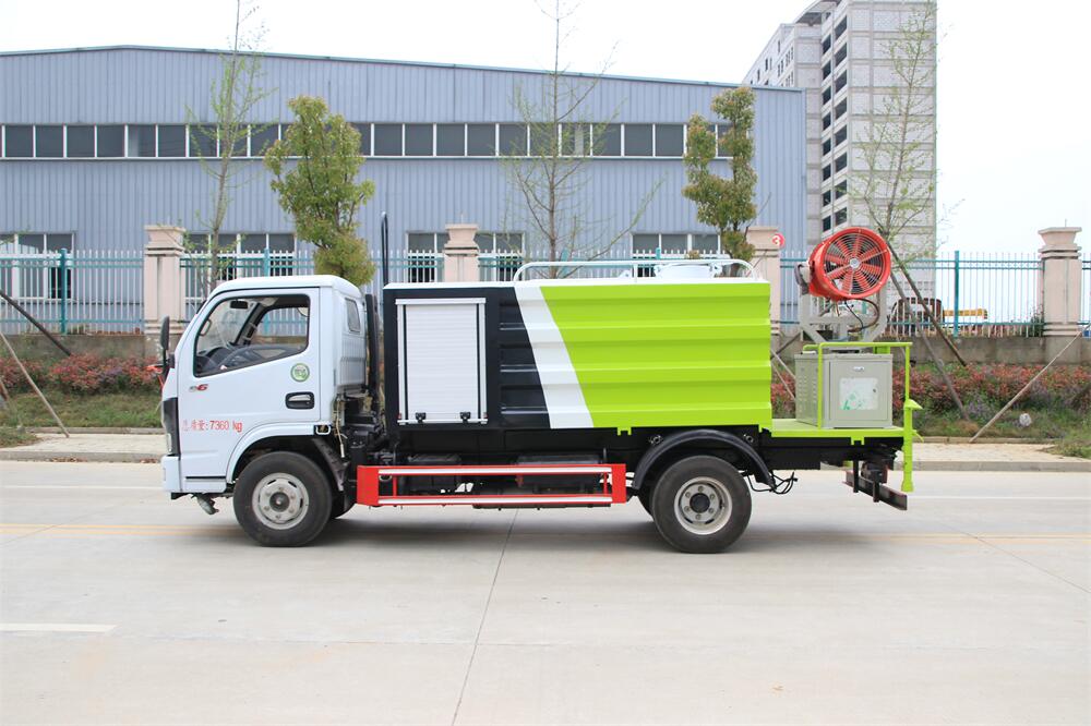 上裝配置:罐體容積為 5-7立方,選配風(fēng)送式霧炮機組射程30米、40米、50米、60米、80米、100米、120米霧炮,罐體鋼板為4mm碳鋼Q235材質(zhì),罐內(nèi)隔板具有防波作用,以減輕汽車行駛時罐體液體沖擊,罐體及整車外形尺寸按照公告。帶大功率專用灑水泵,泵可自吸自排,整車前沖、后灑、側(cè)噴、帶65消防接口,后平臺配CLW-50、CLW-60、CLW-80、CLW-100、CLW-120型風(fēng)送式霧炮機組;罐體前封頭配大功率柴油發(fā)電機組;前封頭帶水位計,后平臺主管路帶1寸澆花接口,后爬梯。帶兩根輸水管及陰陽端。罐體顏色:銀/灰/綠,罐體兩側(cè)噴“多功能抑塵車”字樣,貼反光標(biāo)示。