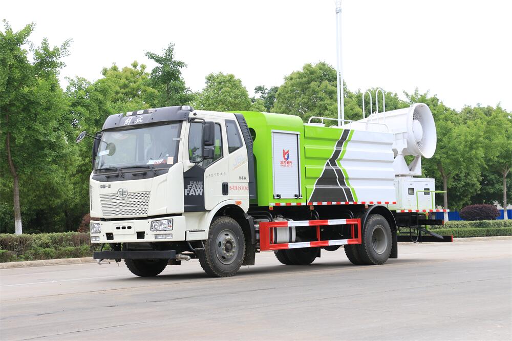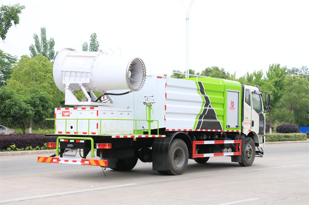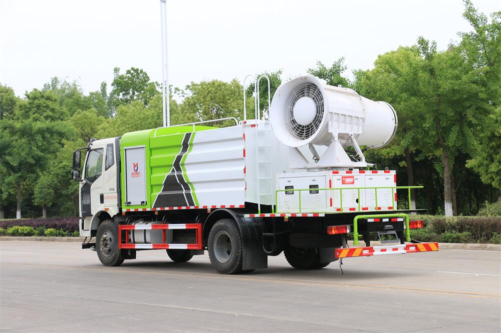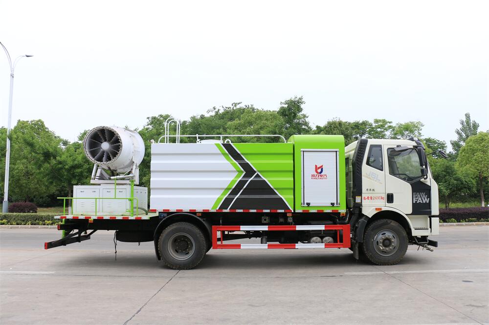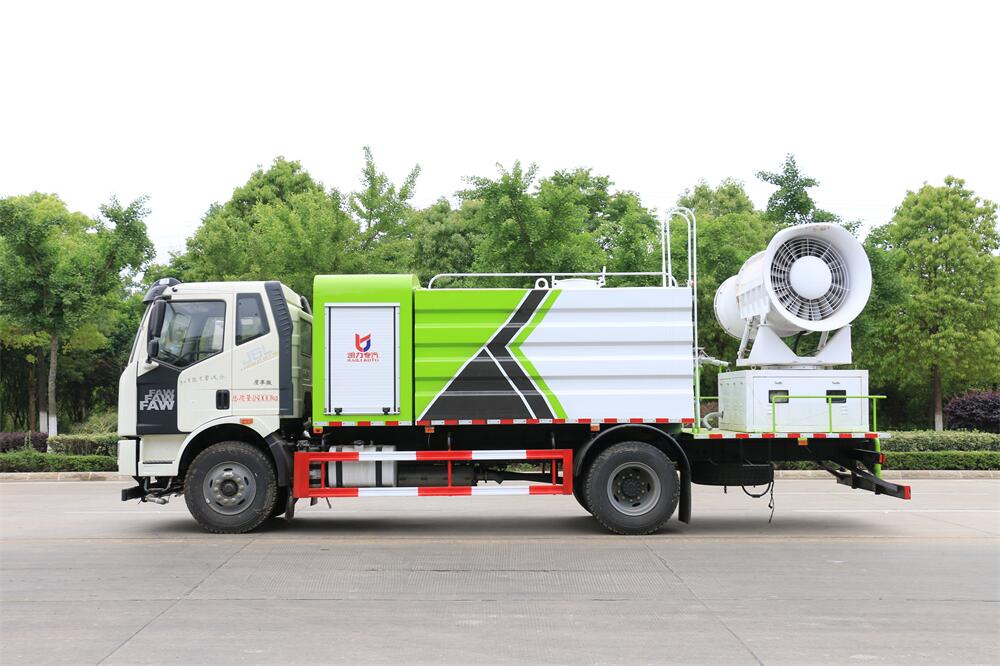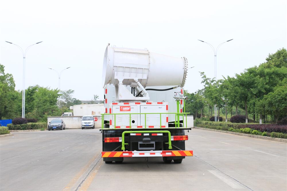 上裝配置:罐體容積為 12立方,選配風送式霧炮機組射程30米、40米、50米、60米、80米、100米、120米霧炮,罐體鋼板為4mm碳鋼Q235材質,罐內隔板具有防波作用,以減輕汽車行駛時罐體液體沖擊,罐體及整車外形尺寸按照公告。帶大功率專用灑水泵,泵可自吸自排,整車前沖、后灑、側噴、帶65消防接口,后平臺配CLW-50、CLW-60、CLW-80、CLW-100、CLW-120型風送式霧炮機組;罐體前封頭配大功率柴油發電機組;前封頭帶水位計,后平臺主管路帶1寸澆花接口,后爬梯。帶兩根輸水管及陰陽端。罐體顏色:銀/灰/綠,罐體兩側噴“多功能抑塵車”字樣,貼反光標示。