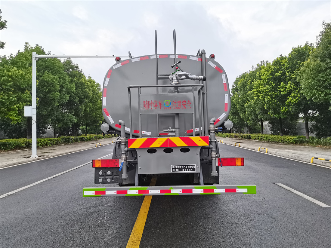 灑水車前裝有鴨形噴嘴或圓頭沖嘴,后面裝有圓柱開灑水噴嘴或蓮蓬頭噴嘴,后部有一工作平臺(tái),裝配有水炮。后部還可裝8個(gè)噴嘴(選裝)。